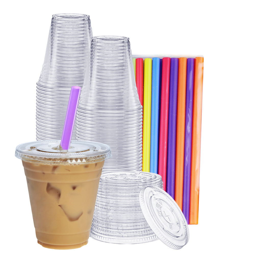 12 oz. Crystal Clear Plastic Cups With Flat Lids & Colored Straws - Disposable Clear Drinking Cups For Iced Coffee, Cold Drinks, Milkshakes, and Smoothies